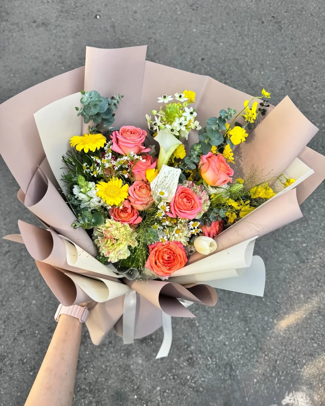 春光系花束| 橘黃香吉士玫瑰搭配黃洋甘菊、海芋、噴泉草與尤加利 一束輕柔卻明亮的色調